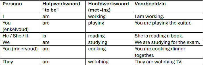 | Persoon | Hulpwerkwoord "to be" | Hoofdwerkwoord (met -ing) | Voorbeeldzin |